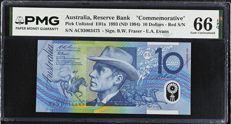 Australia 10 Dollars 1993 / 1994 Fraser Red S/N Commemorative Gem UNC PMG 66 EPQ