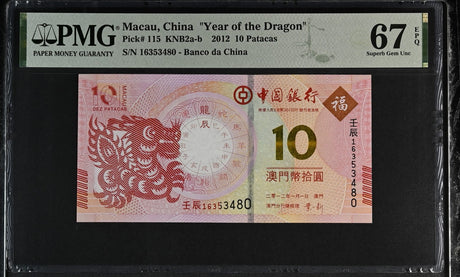 Macau Macao 10 Patacas 2012 P 115 Year of Dragon BOC Superb Gem UNC PMG 67 EPQ