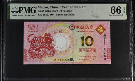 Macau 10 Patacas 2020 P 122A Mouse BOC Commemorative Gem UNC PMG 66 EPQ