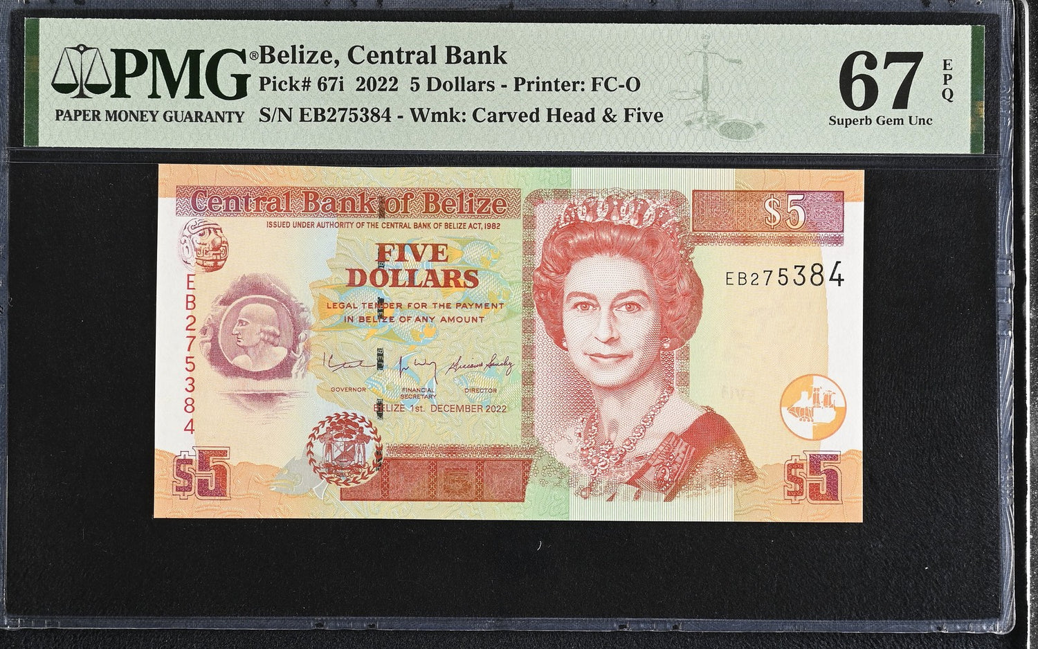 Belize 5 Dollars 2022 P 67 i Superb Gem UNC PMG 67 EPQ