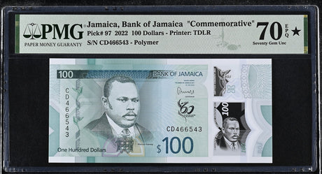 Jamaica 100 Dollars 2022 P 97 Comm. Superb Gem UNC PMG 70 EPQ Extra Star TOP POP