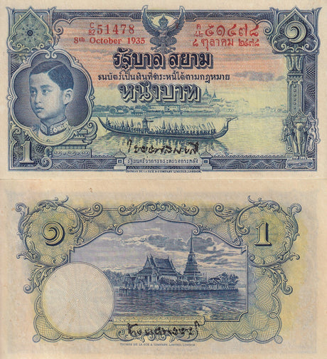 Thailand 1 Baht 1935 P 26 Government Siam Crisp Original Paper AUnc Little Tone
