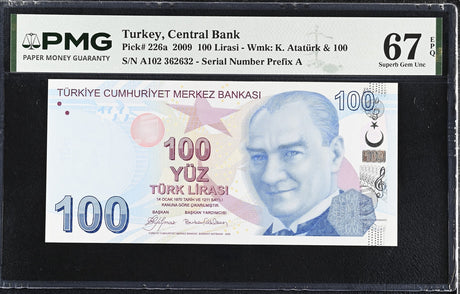 Turkey 100 Lira 2009 P 226 a Prefix A Superb Gem UNC PMG 67 EPQ