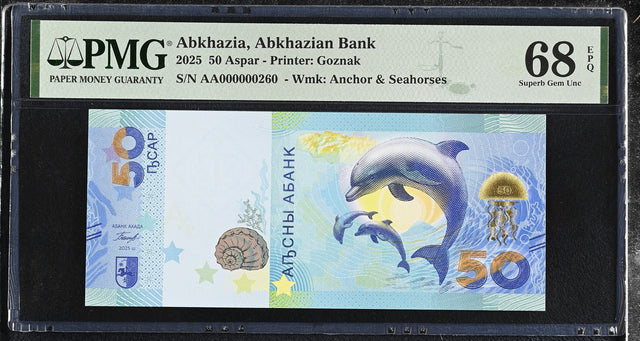 ABKHAZIA 50 Apsar 2025 AA LOW # 260 Dolphin Superb Gem UNC PMG 68 EPQ