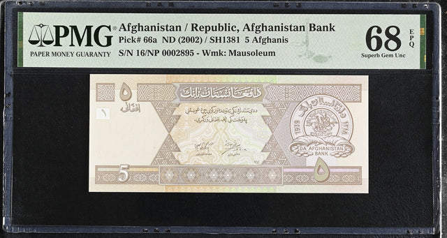 Afghanistan 5 Afghanis ND 2002 P 66 a Superb Gem UNC PMG 68 EPQ