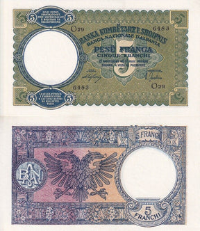 Albania 5 Franga (Franchi) 1939 P 6 Italian occupation Banknote UNC