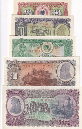 Albania Set 5 AUnc 10 50 100 500 1000 Leke 1957 P 28 29 30 31 32 is backordered and will ship as soon as it is back in stock.