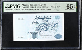 Algeria 100 Dinars 1992 ND 1996 P 137 Gem UNC PMG 65 EPQ is backordered and will ship as soon as it is back in stock.