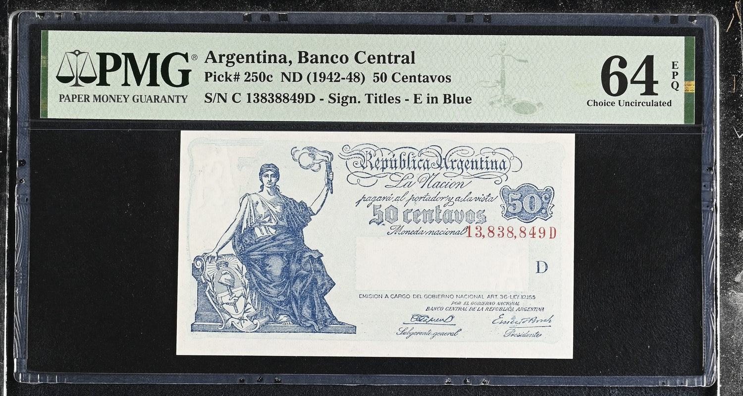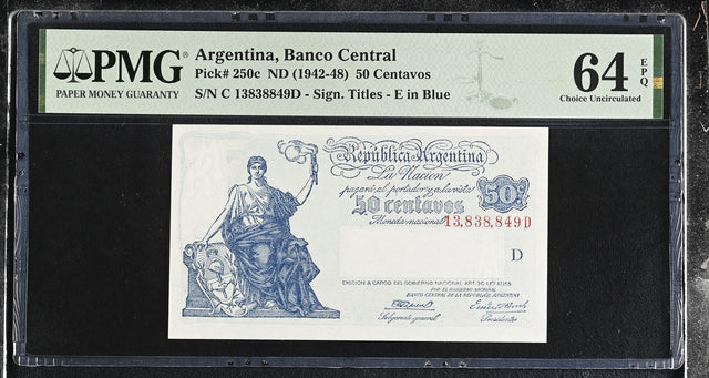 Argentina 50 Centavos ND 1942-48 P 250 c Choice UNC PMG 64 EPQ TOP POP