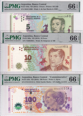 Argentina Set 3; 5 10 100 Pesos 2016 P 358- 360 Superb Gem UNC PMG 66 EPQ