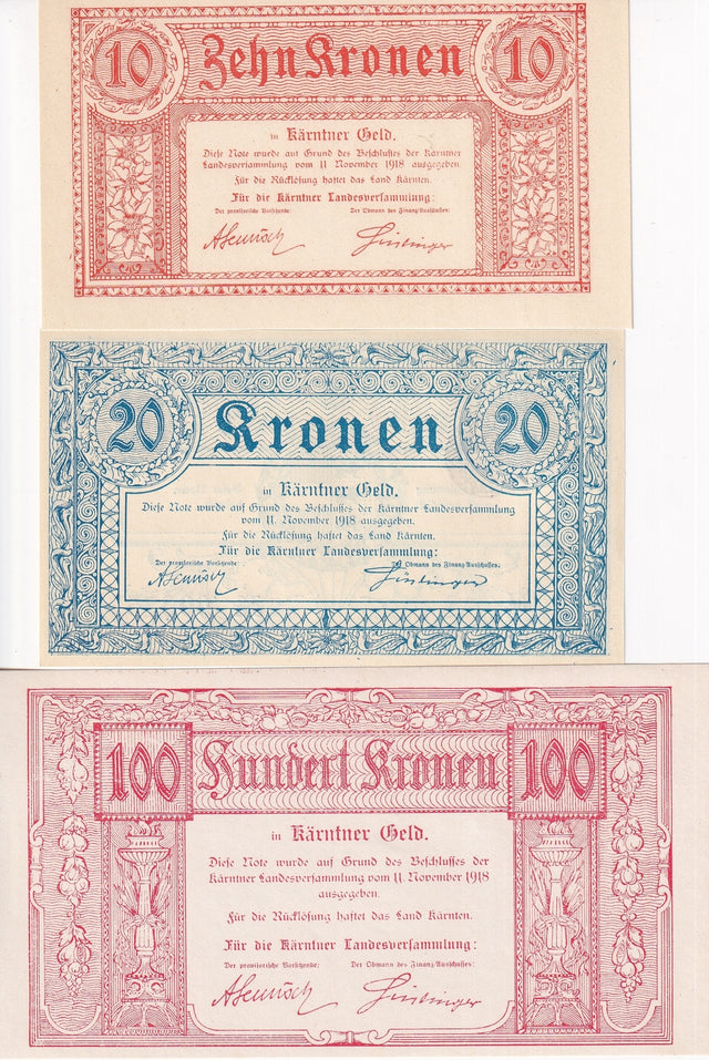 Austria SET 3; 10 20 100 Kronen 1918 Karnten(Carinthia) P S102 S103 S105 UNC