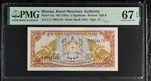 Bhutan 5 Ngultrum ND 1985 P 14 a Sign 1 C/1 Superb Gem UNC PMG 67 EPQ