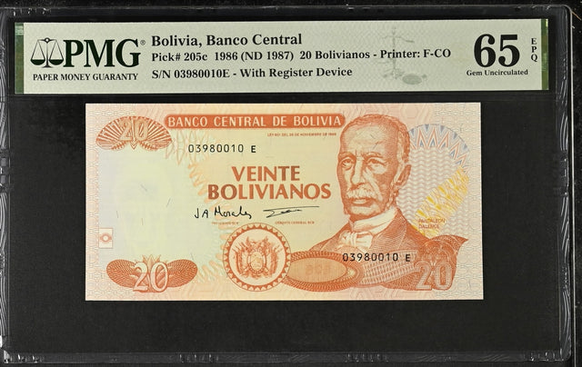 Bolivia 20 Bolivianos 1986 ND 1987 P 205 c Gem UNC PMG 65 EPQ