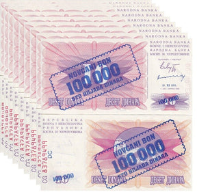 Bosnia 100000 on 10 Dinara 1993 (1992) P 34 b UNC LOT 10 PCS
