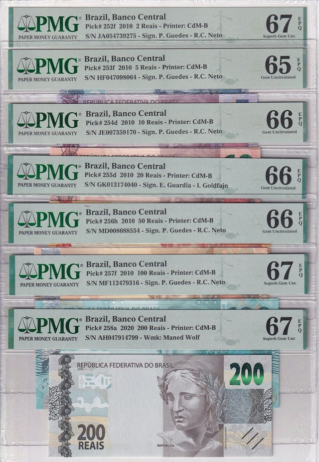 Brazil Set 7; 2 5 10 20-200 Reais 2010 P 252-P 258 Superb Gem UNC PMG 65-67 EPQ