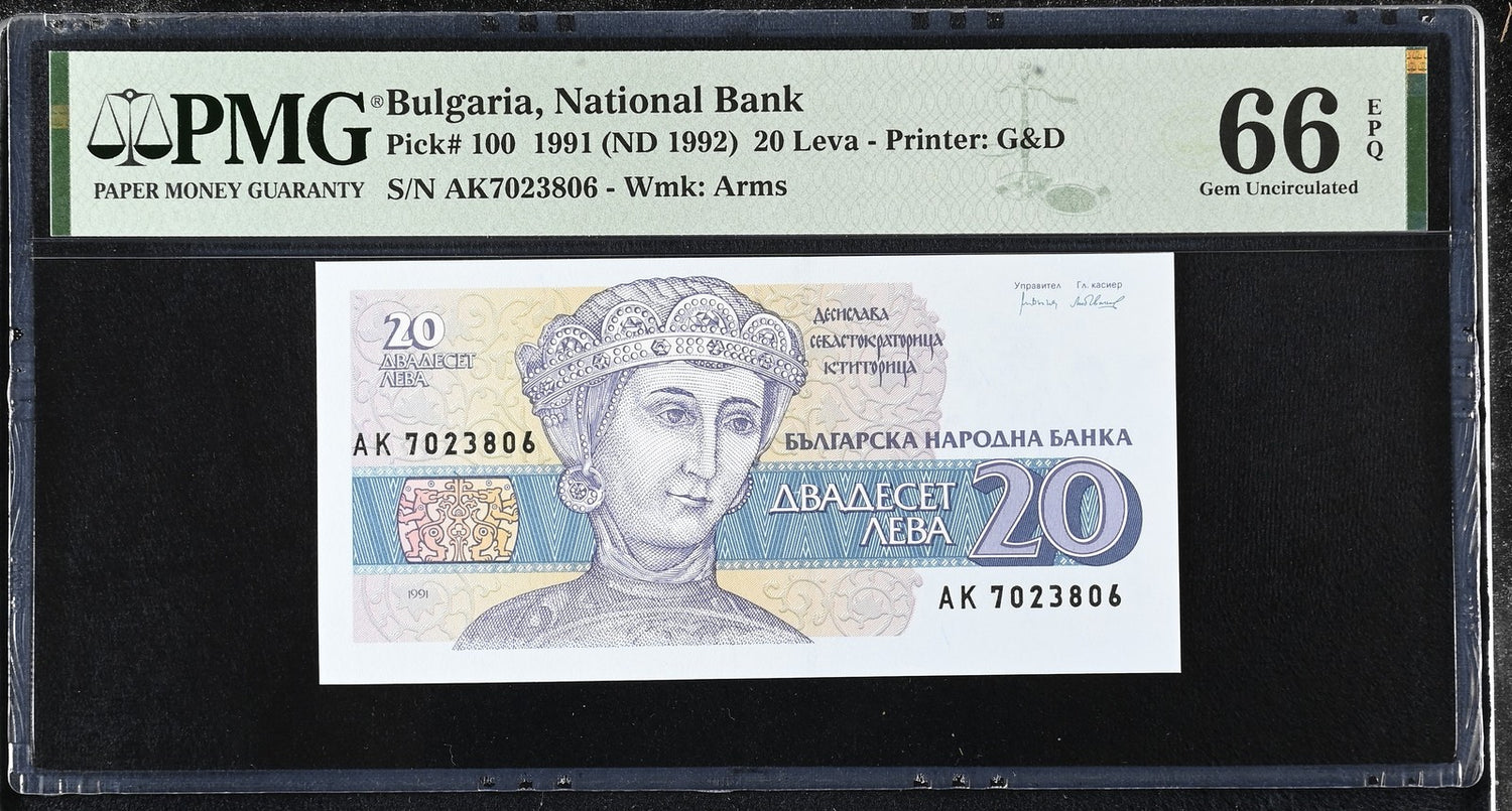 Bulgaria 20 Leva 1991 ND 1992 P 100 GEM UNC PMG 66 EPQ