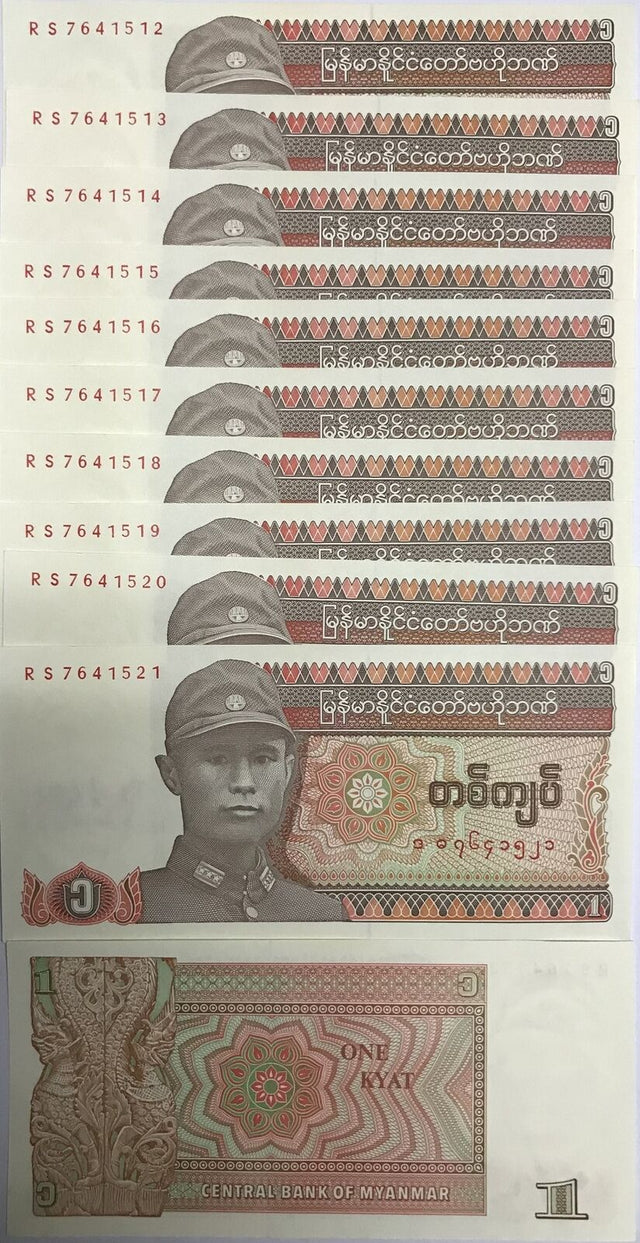 Burma Myanmar 1 Kyats 1990 P 67 UNC LOT 10 PCS