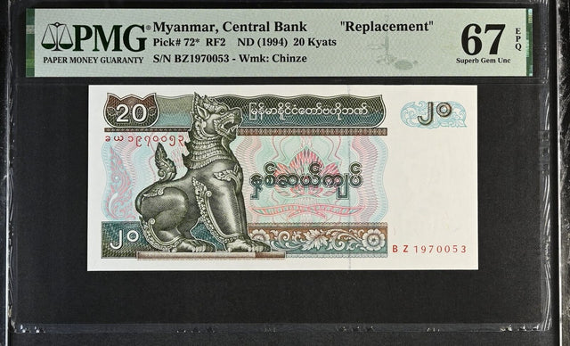 Burma Myanmar 20 Kyats 1994 P 72* Replacement Superb Gem UNC PMG 67 EPQ