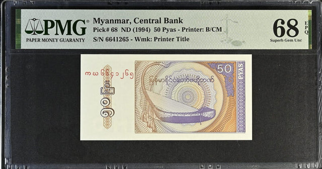 Burma Myanmar 50 PYAS ND 1994 P 68 Superb Gem UNC PMG 68 EPQ
