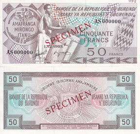 Burundi 50 Francs 1983 P 28 b Specimen UNC