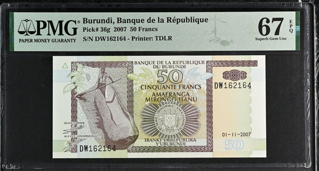 Burundi 50 Francs 2007 P 36 g Superb Gem UNC PMG 67 EPQ