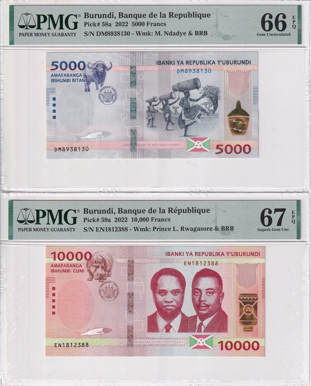 Burundi Set 2; 5000 10000 Francs 2022 P 58 59 Superb Gem UNC PMG 66 67 EPQ