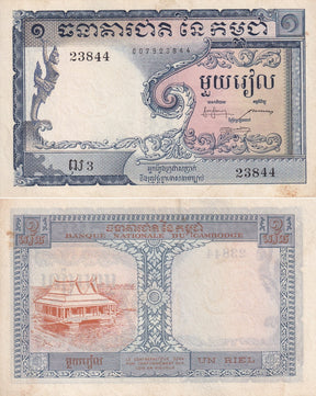 Cambodia 1 Riel ND 1955 P 1 AUnc Yellow Foxing