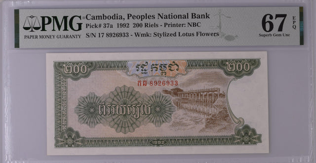 Cambodia 200 Riels 1992 P 37 a Superb Gem UNC PMG 67 EPQ Top Pop