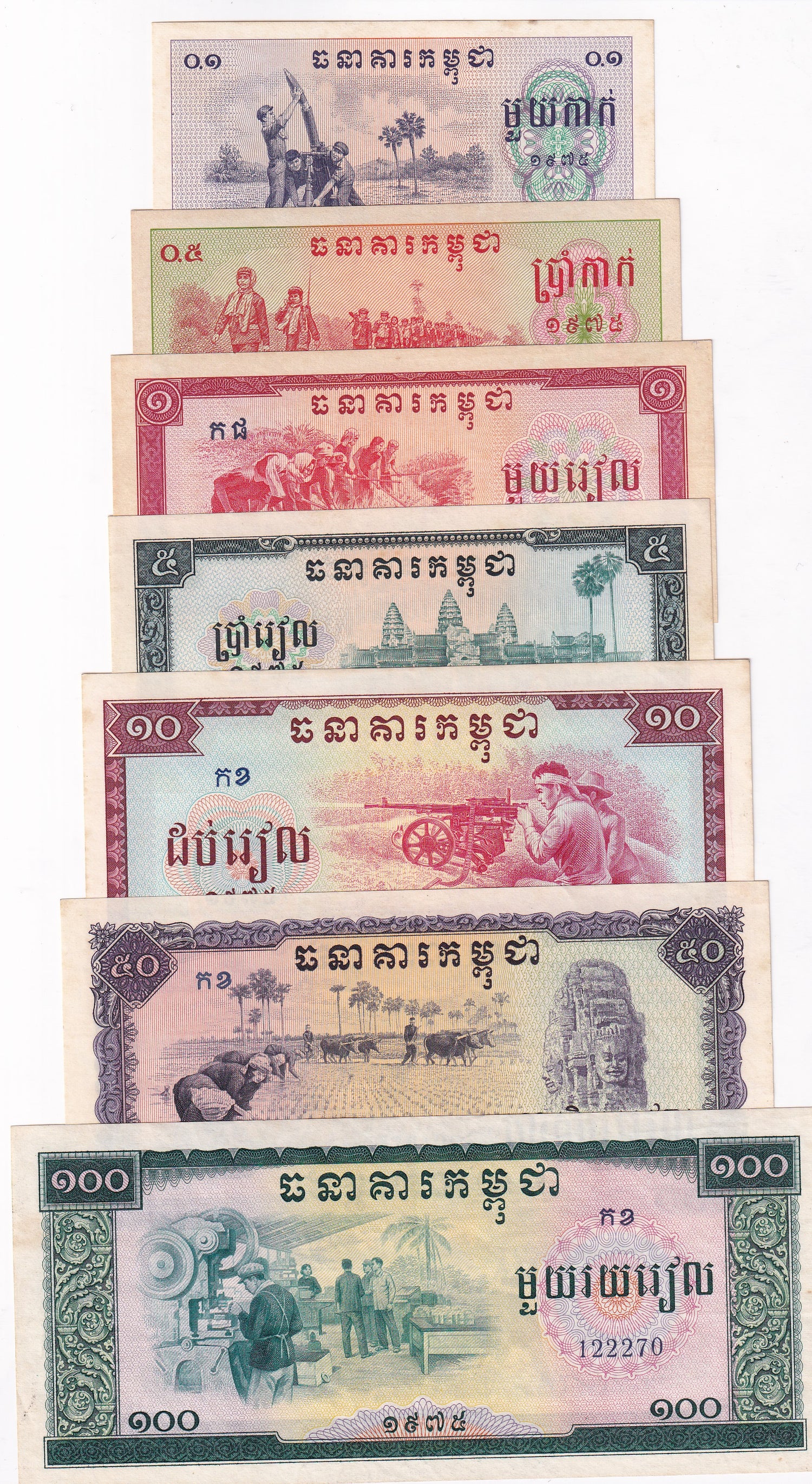 Cambodia SET 7 AU Yellow Foxing 0.1 0.5 1 5 10 50 100 Riels ND 1975 P 18 19 -24