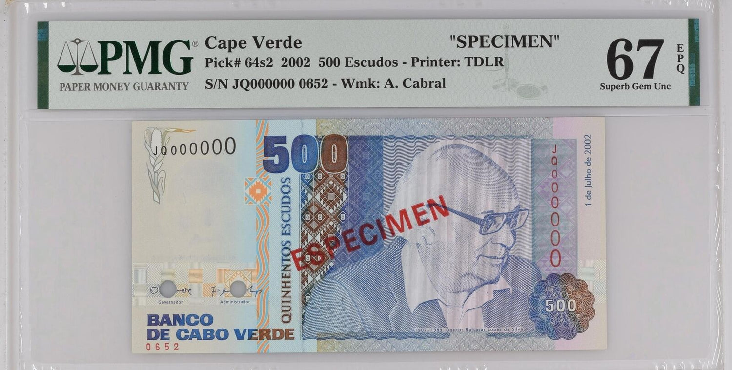 Cape Verde 500 Escudos 2002 P 64s2 Specimen Superb Gem UNC PMG 67 EPQ Top Pop