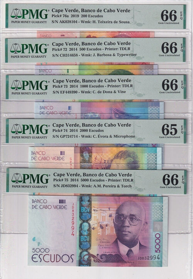 Cape Verde Set 5; 200 500 1000-5000 Escudos 2014 P 72- 76 Gem UNC PMG 65 66 EPQ