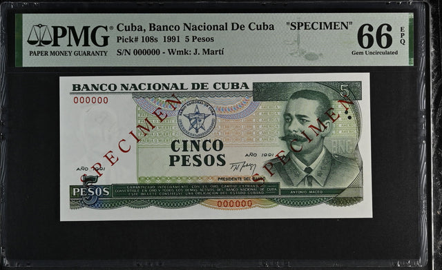 Central America 5 Pesos 1991 P 108 s Specimen GEM UNC PMG 66 EPQ