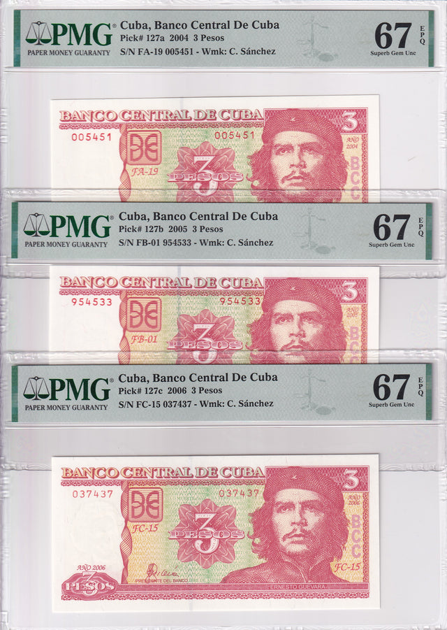 Central America SET 3 ,3 Pesos 2004 2005 2006 P 127 a b c CHE Guevara SUPERB GEM PMG 67 EPQ