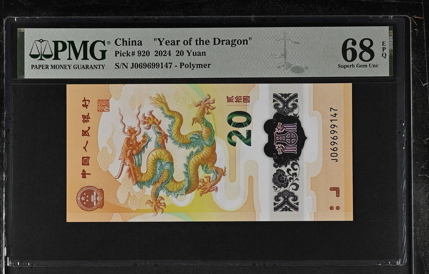 China 20 Yuan 2024 P 920 Dragon Polymer COMM. Superb Gem UNC PMG 68 EPQ