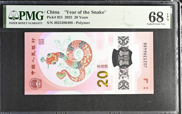 China 20 Yuan 2025 P 921 SNAKE Polymer Superb Gem UNC PMG 68 EPQ