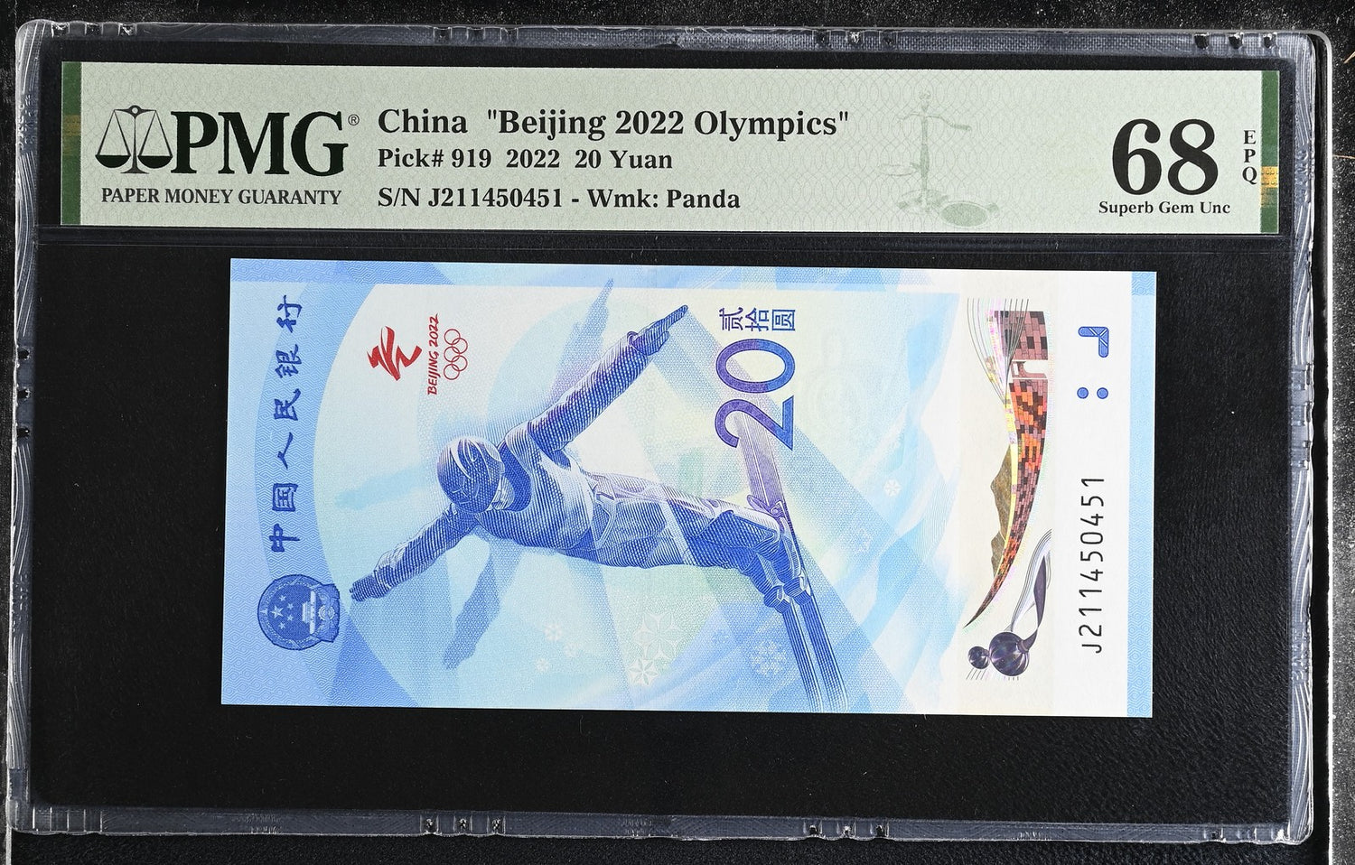 China 20 Yuan Olympic 2022 P 919 Superb Gem PMG 68 EPQ