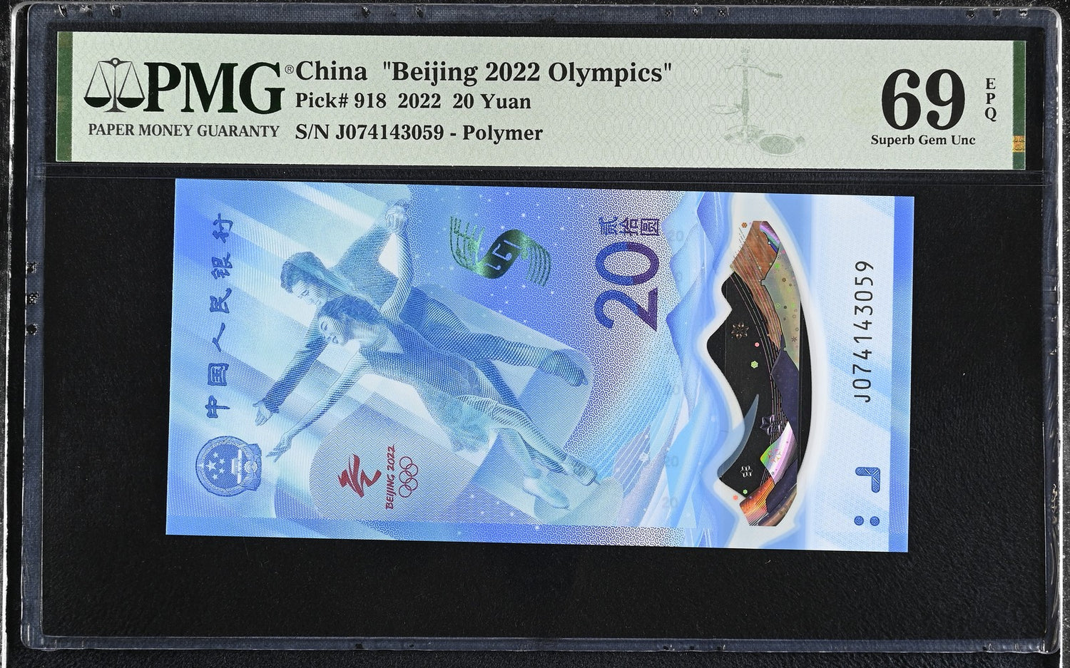 China Beijing Olympic Games 20 Yuan 2022 P 918 Superb Gem UNC PMG 69 EPQ