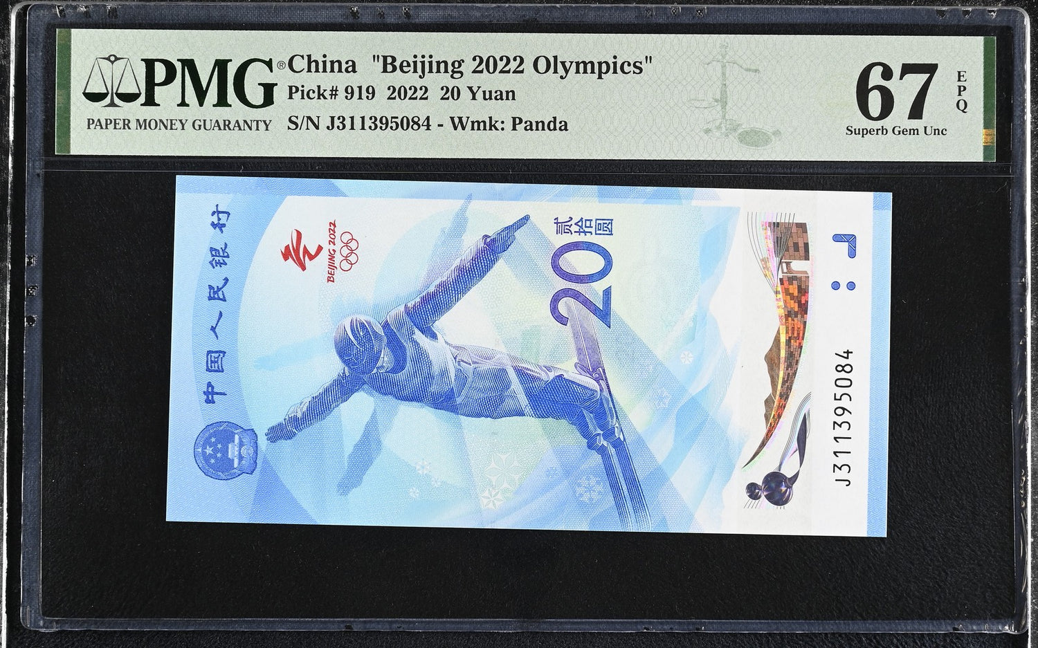 China Beijing Olympic Games 20 Yuan 2022 P 919 Superb Gem UNC PMG 67 EPQ
