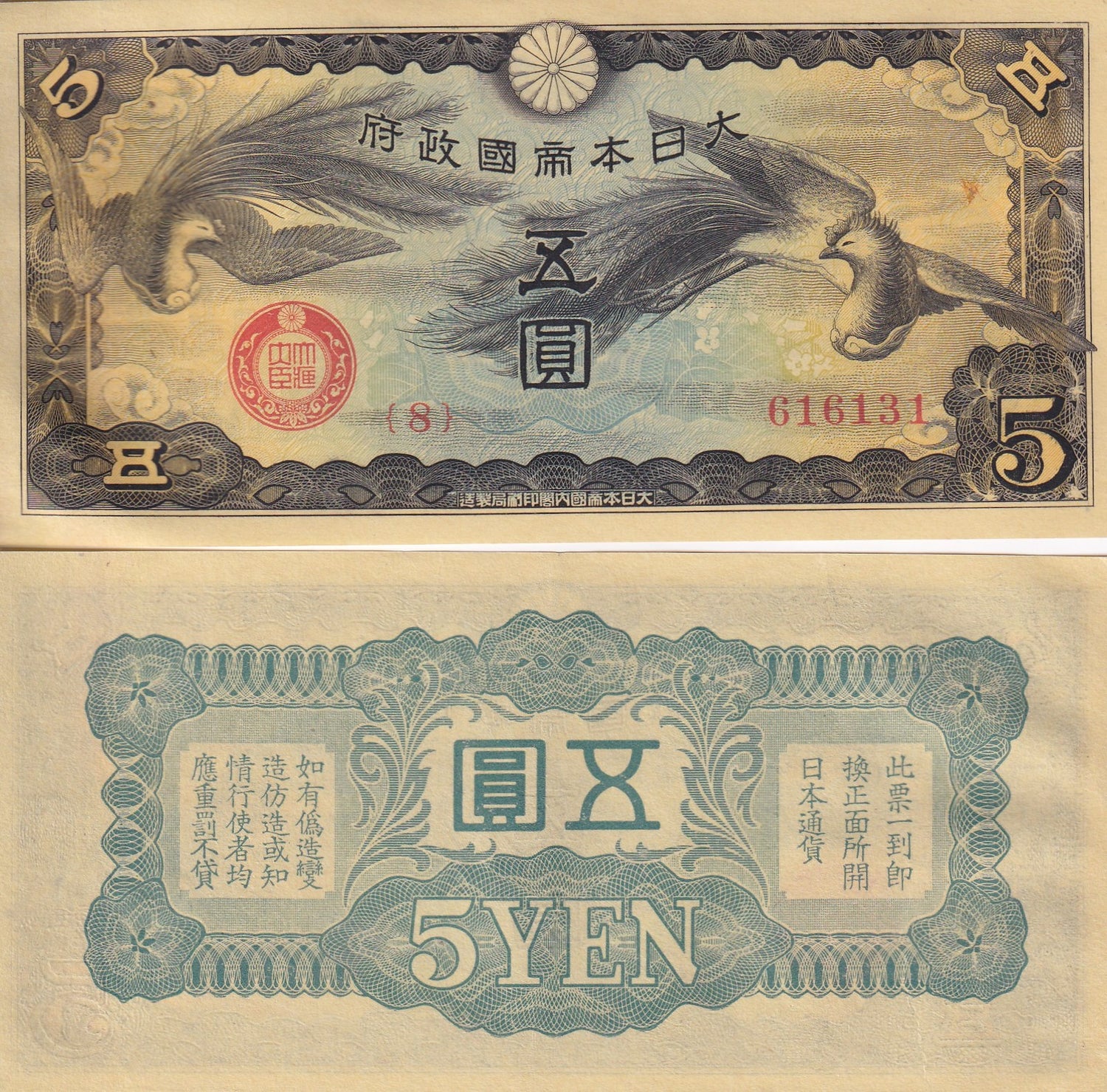 China Japan Military WWII 5 Yen ND 1940 P M17 AUNC W/LITTLE TONE