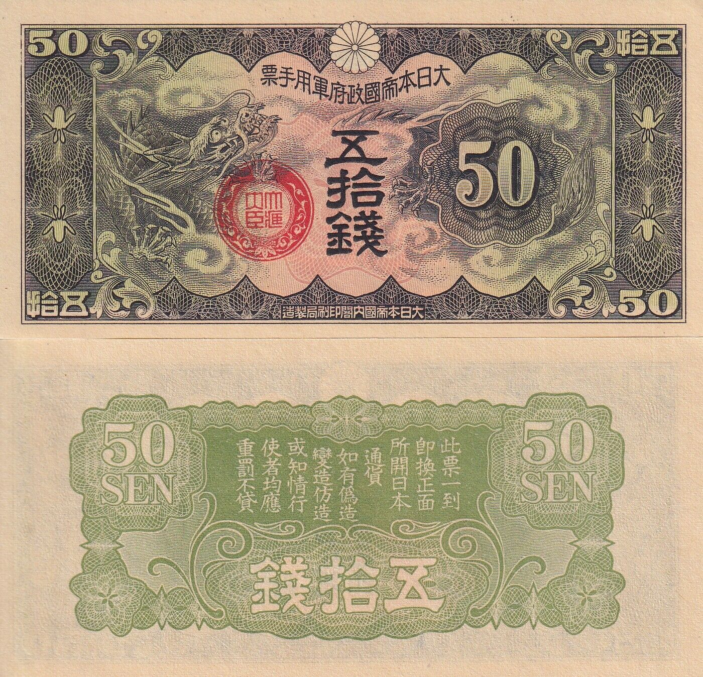 China Japanese Military WWII 50 SEN 1938 Dragon P M14 UNC