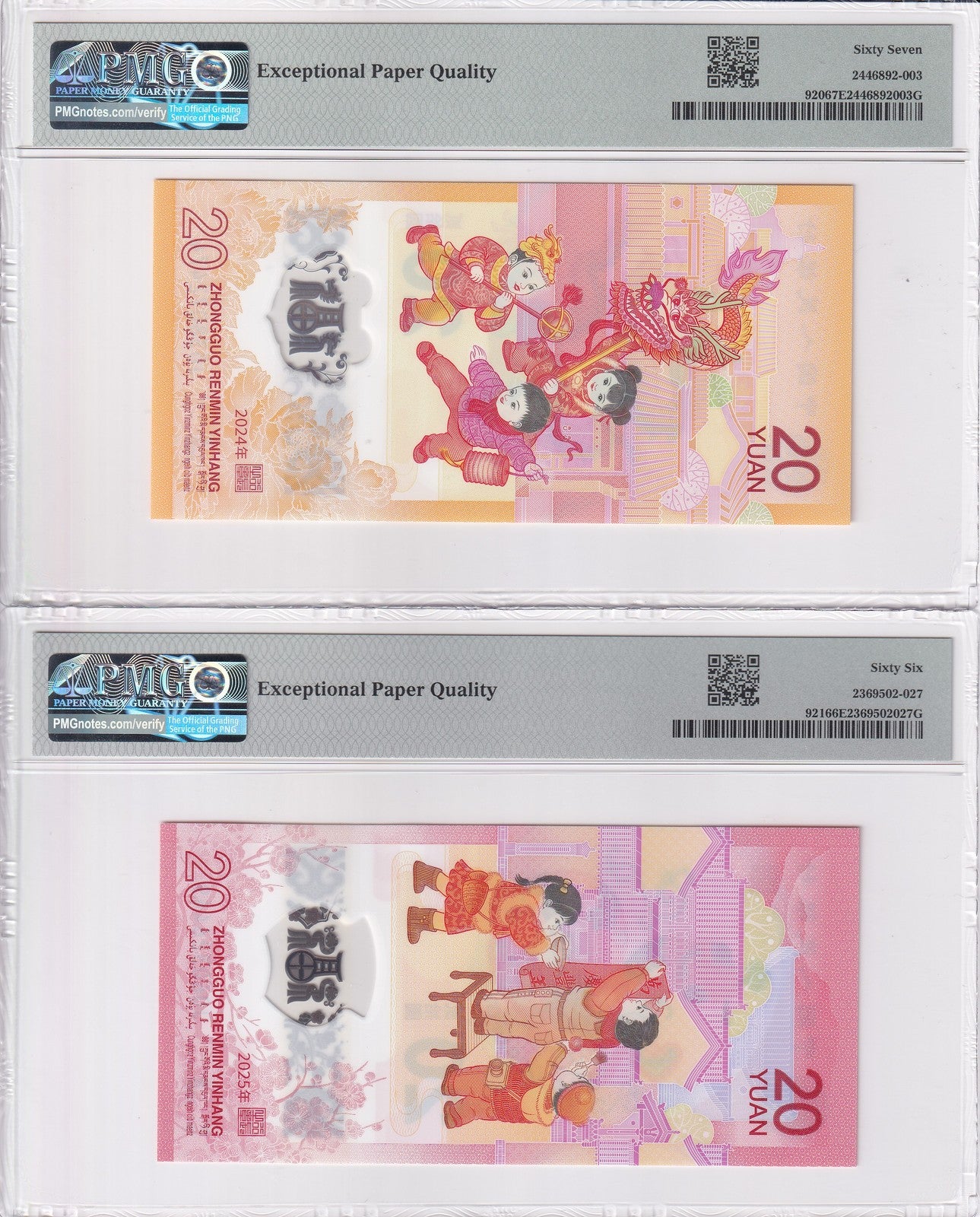 China Set 2; 20 Yuan 2025 P 920 P 921 Dragon Snake Superb Gem UNC PMG 66 67 EPQ