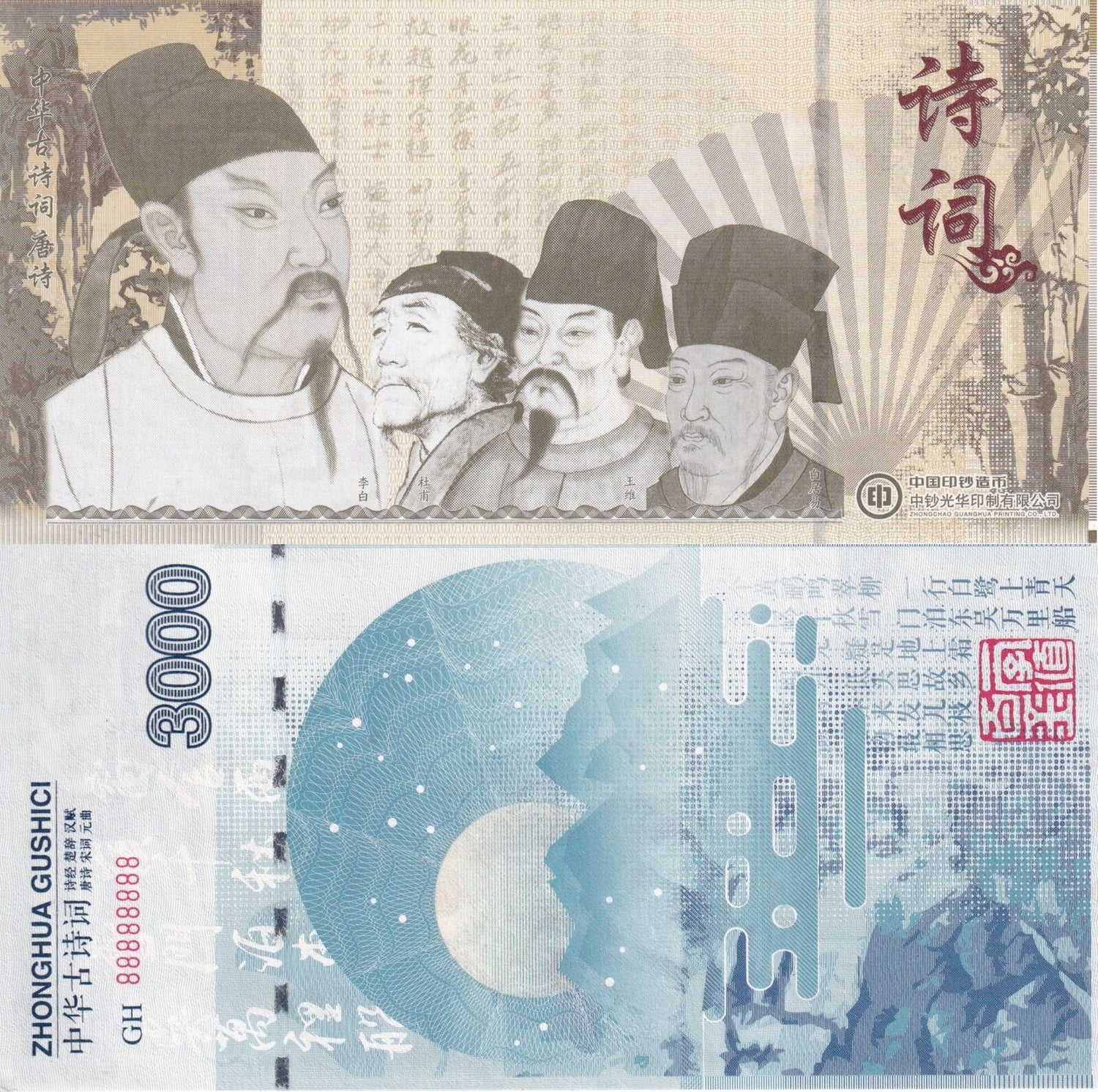 China Test note 3000 Chinese letter Precursor Blue Zhongchao engraving