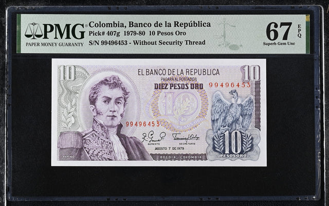 Colombia 10 Pesos 1979 P 407 g Superb Gem UNC PMG 67 EPQ