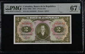 Colombia 2 Pesos Oro 1955 P 390 d Superb Gem UNC PMG 67 EPQ
