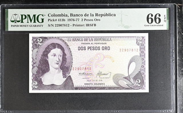 Colombia 2 Pesos Oro 1976 P 413 b Gem UNC PMG 66 EPQ