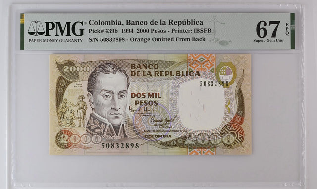 Colombia 2000 Pesos 1994 P 439 b Superb Gem UNC PMG 67 EPQ
