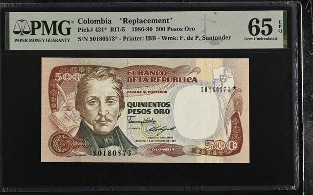 COLOMBIA 500 PESO 1986-1990 P 431* Replacement Gem UNC PMG 65 EPQ