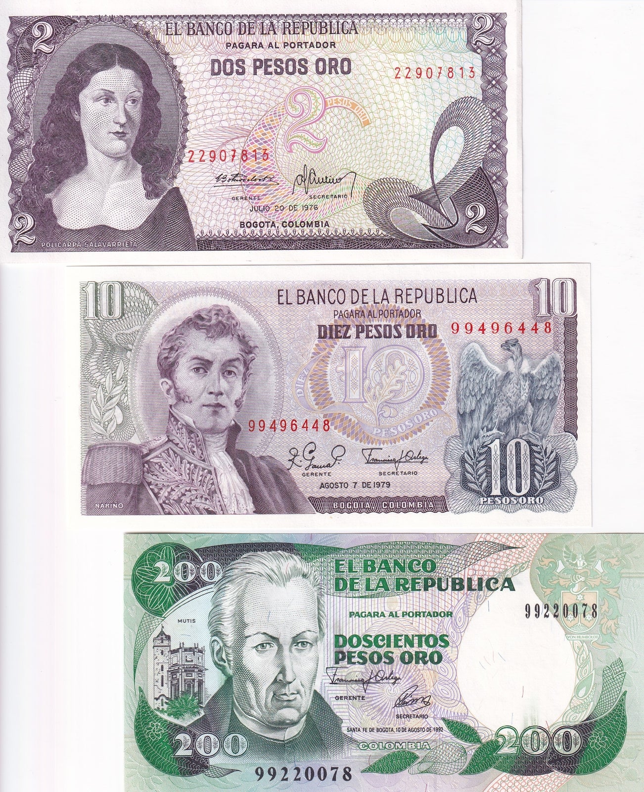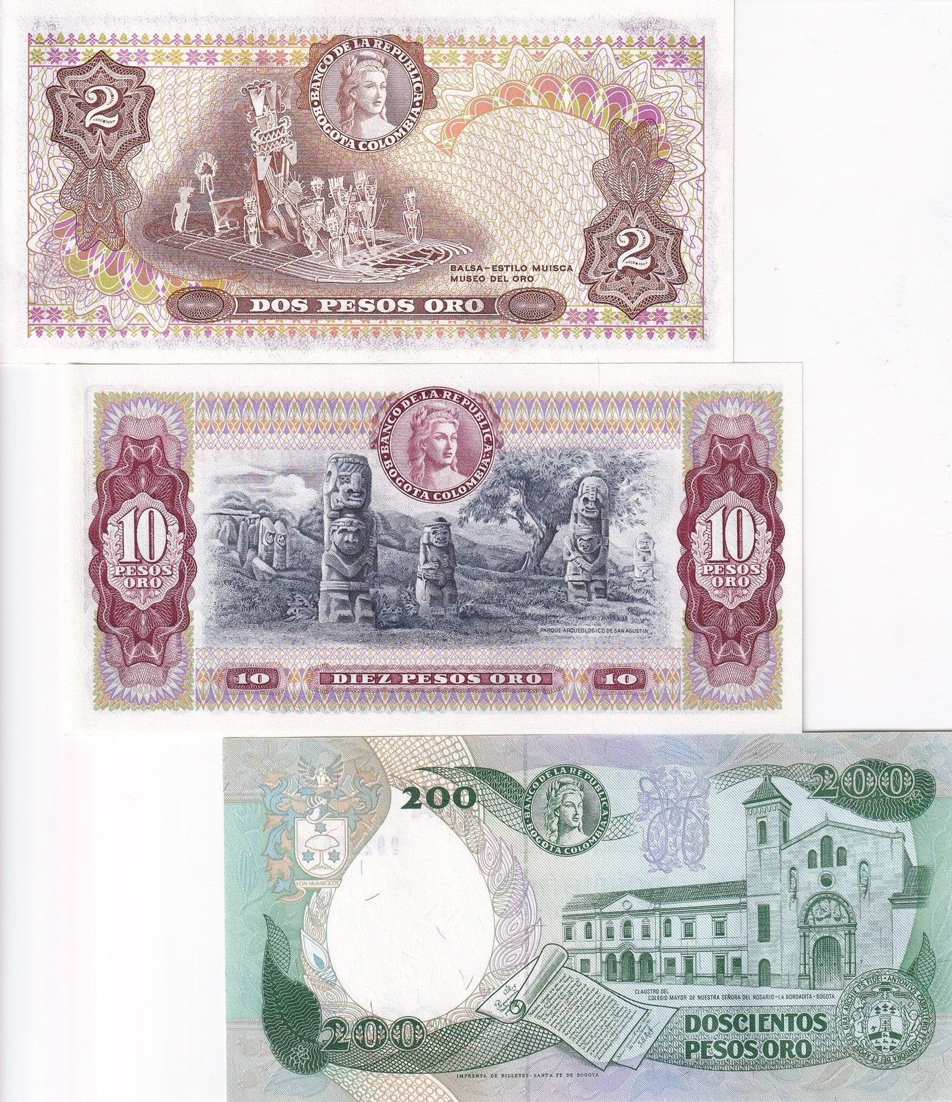 Colombia Set 3 PCS 2 10 200 Pesos Random Year P 407 P 413 P 429A UNC