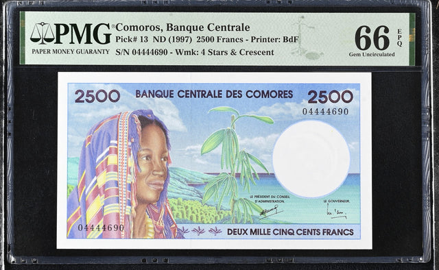 Comoros 2500 Francs ND 1997 P 13 Gem UNC PMG 66 EPQ