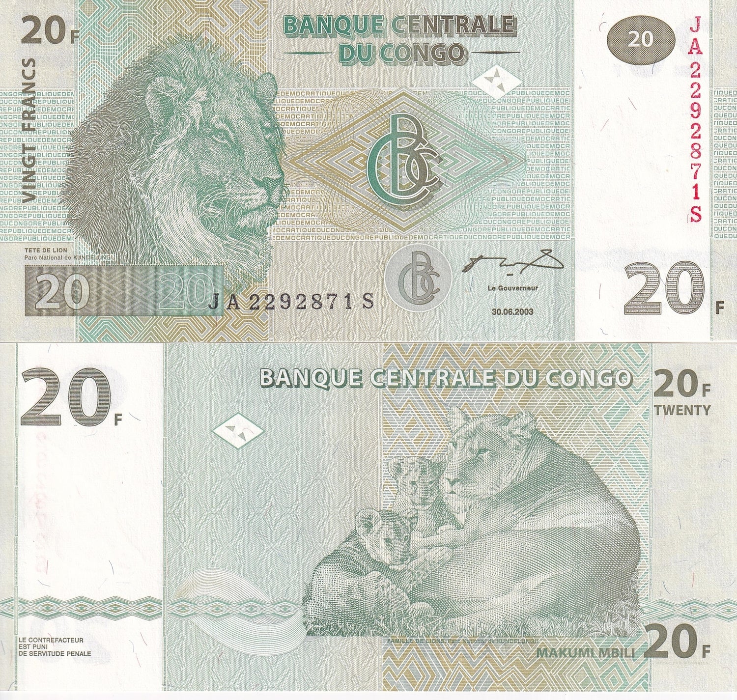 Congo 20 Francs 2003 P 94 UNC